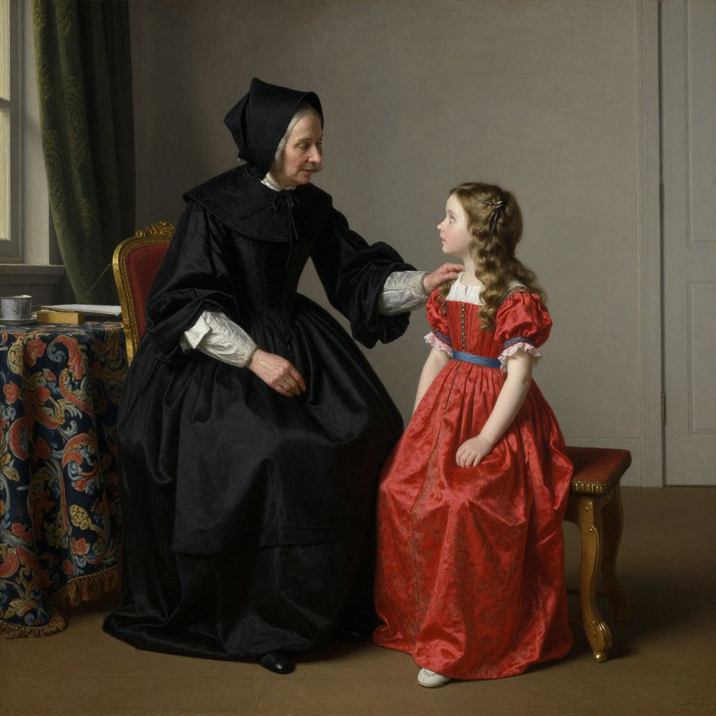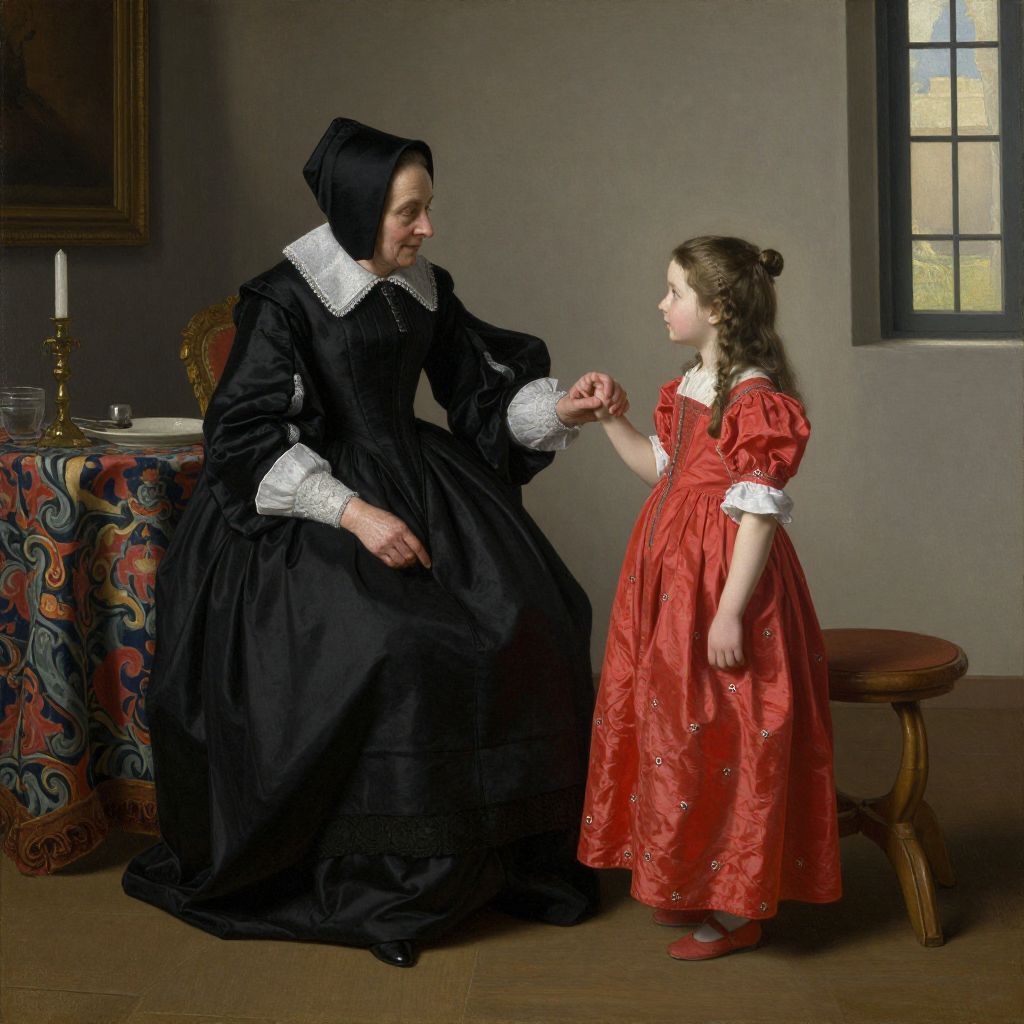 Photograph of a historical scene featuring a mature woman in a black, 17th-century Dutch dress with white lace cuffs, sitting on a red, wooden chair, gently touching the shoulder of a young girl in a red, satin dress with white lace trim and a blue sash. The woman has a black headscarf, light skin, and an attentive expression. The girl, with light brown hair, looks up at her. The background includes a window with dark green curtains and a table with a colorful, patterned cloth. The room has a beige carpet and plain, light gray walls.