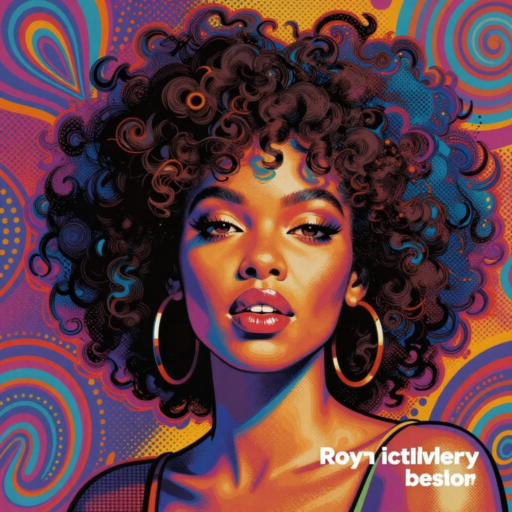 Close-up digital illustration of an exotic African woman with large, voluminous curly hair. Her face is rendered in vibrant, psychedelic colors with a halftone effect. The background features a 1960s style psychedelic pattern with dot matrix and paisley elements. The artwork is inspired by Roy Lichtenstein’s pop art style.