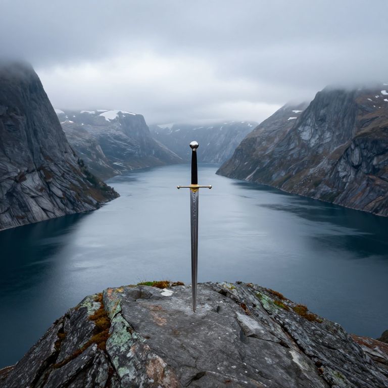 Photograph of a solitary sword standing on a rocky ledge, overlooking a misty, blue fjord surrounded by steep, snow-capped mountains.