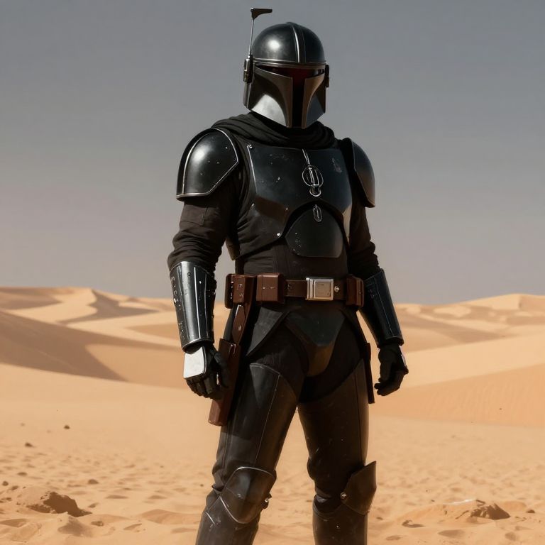 Photograph of a black-armored Mandalorian standing in a sandy desert, wearing a helmet with a visor, under a clear blue sky.