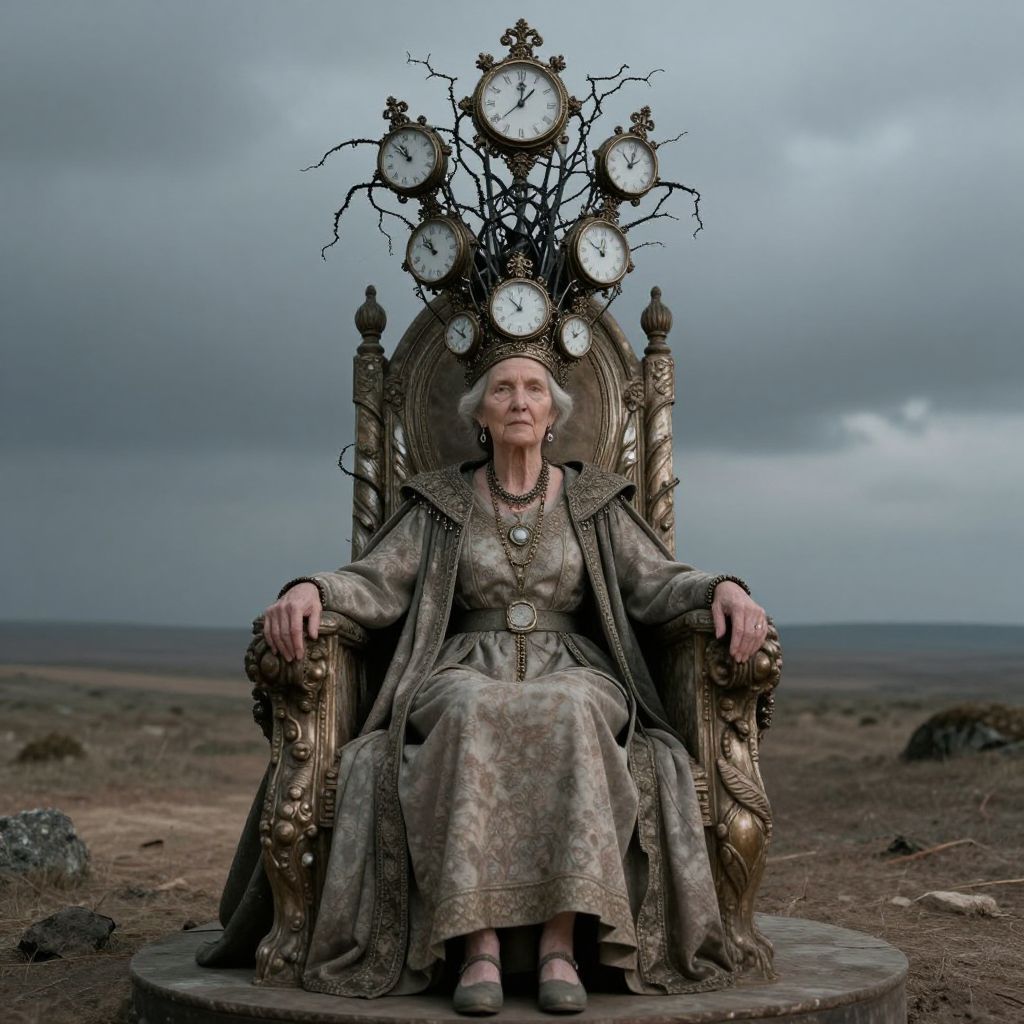 An elderly woman sits regally upon a grand, weathered throne amidst a desolate landscape, crowned with an elaborate headdress of interwoven clocks and spindly tendrils, defying the passage of time in a hauntingly surreal tableau.