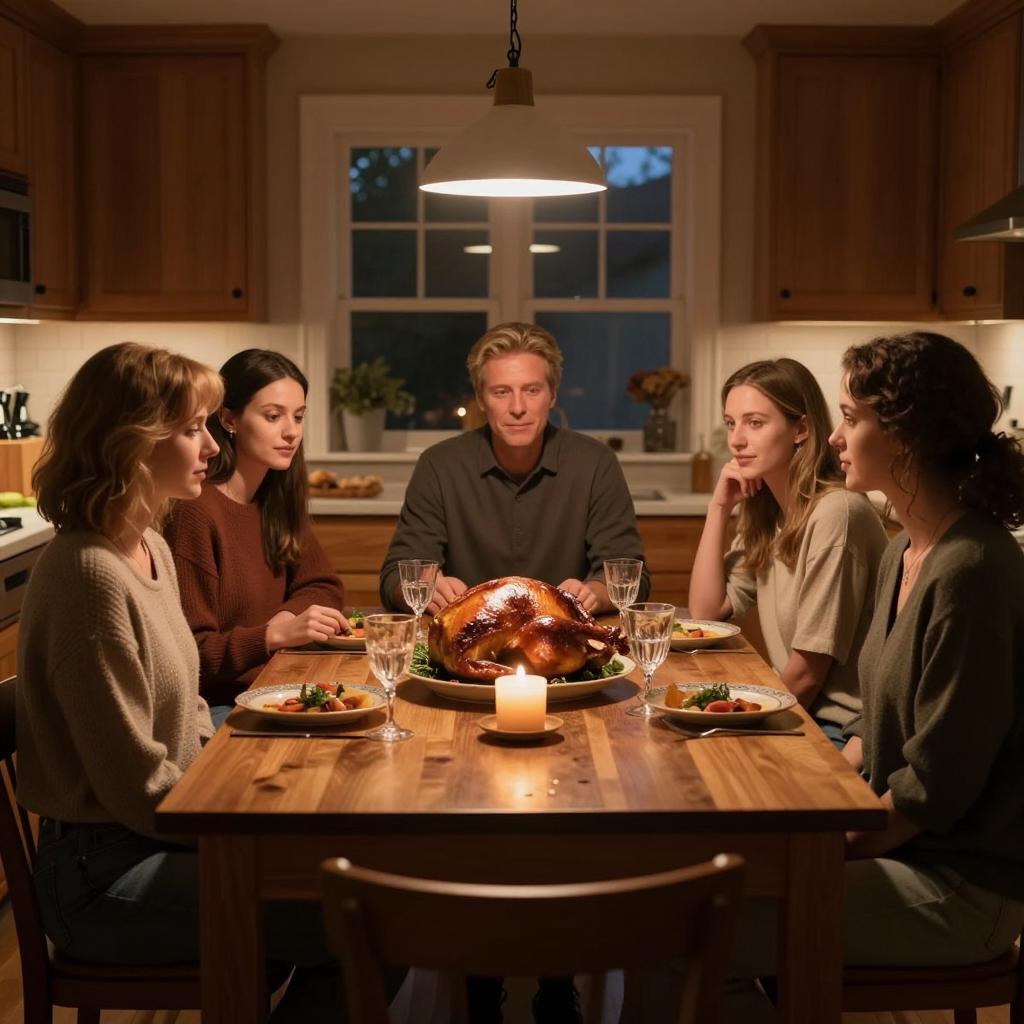 Photograph of a family gathering outdoors. Six people, children and adults, around a table with a turkey centerpiece. Adults wear 70s-style clothes, children in caps and t-shirts. Tree with paper cups in background. Smiling faces, casual poses. Bright daylight, greenery.