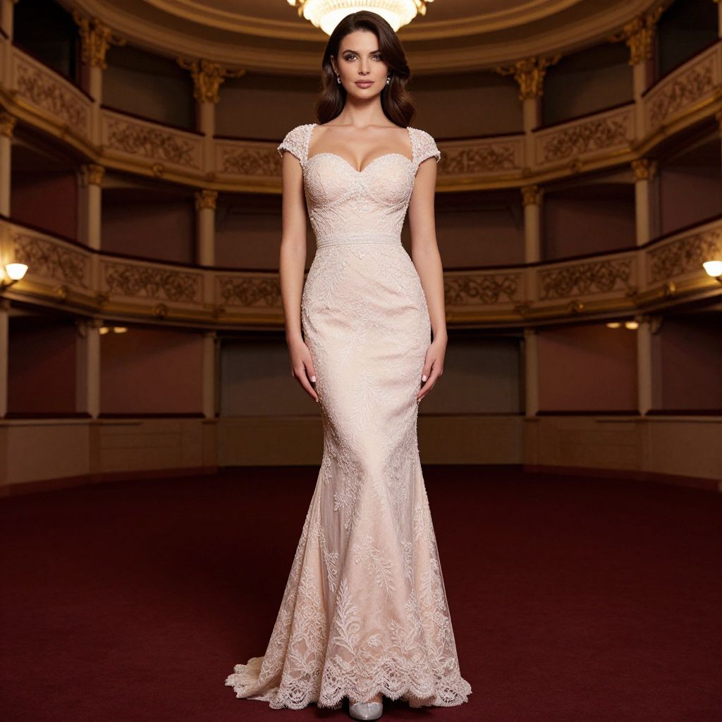 A woman, classic elegance, fitted lace gown in pastel blush, beaded detailing, sweetheart neckline, cap sleeves, mermaid silhouette, silver heels, neutral makeup, historic theater, attending a gala, pastel gradient, soft colors, smooth transitions Sexy. Pretty face and beаutiful eyes. Big breasts