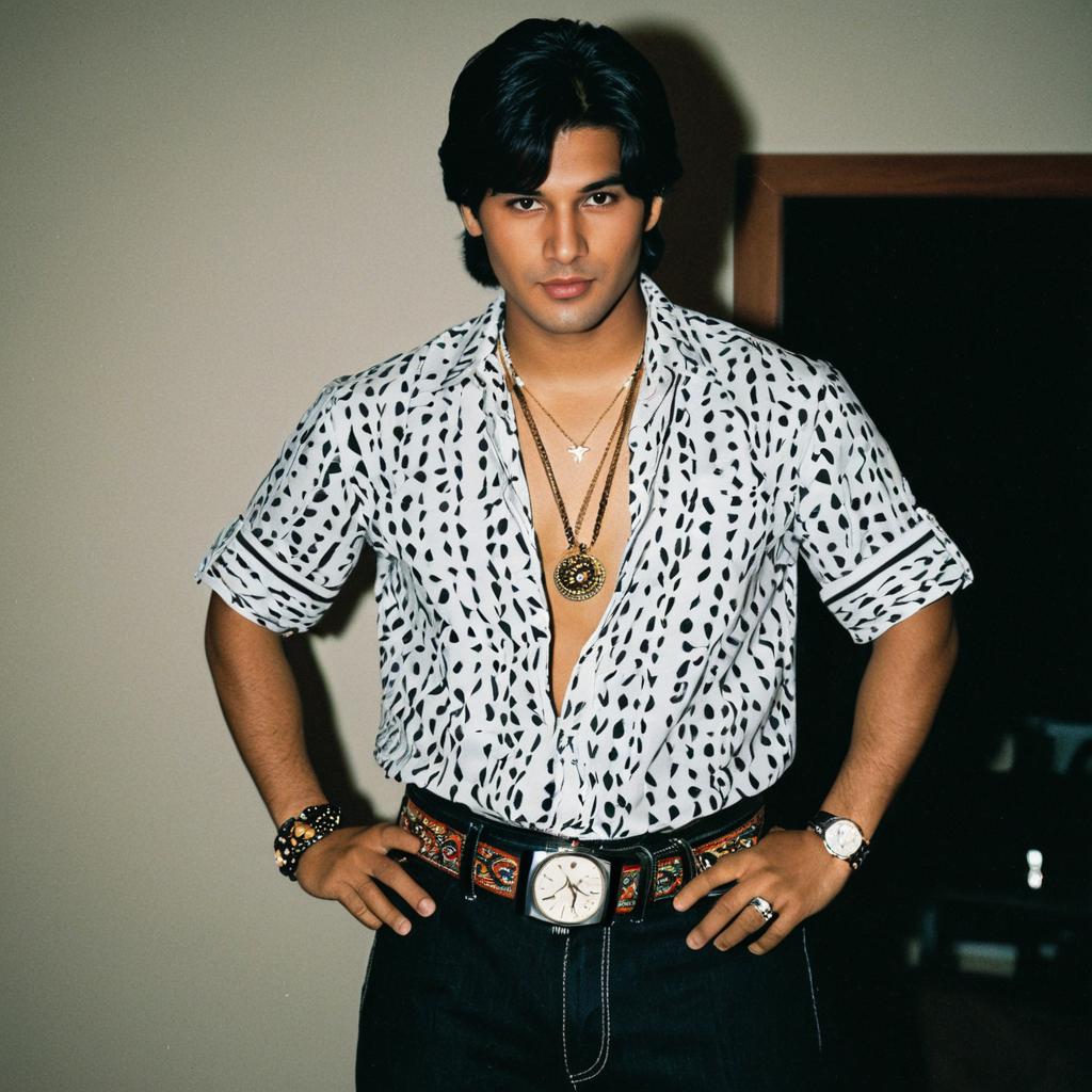 Disco male outfit dress,male focus, 1boy, realistic, jewelry, pants, necklace, shirt, solo focus, looking at viewer, black hair, standing