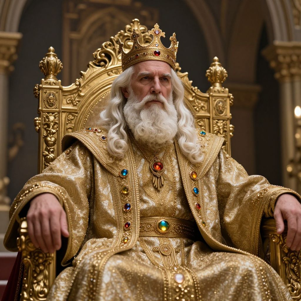 A digitally rendered image of a regal, older man with a long, white beard and crown, sitting on an ornate, gold throne with intricate carvings and colorful gems. He's wearing a luxurious, gold-embroidered robe with matching gems. His expression is serious, and the background features dark, grand architecture with arched columns. The overall vibe is majestic and powerful.