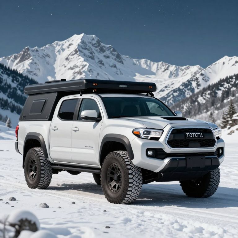Concept Art a overlanding toyota tacoma ultrarealistic with snowy mountains and stars in the background,