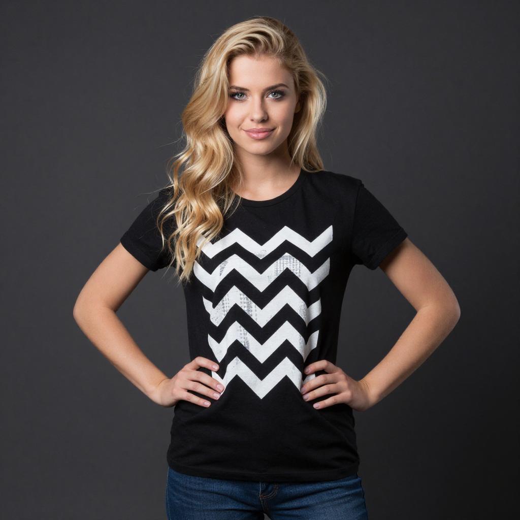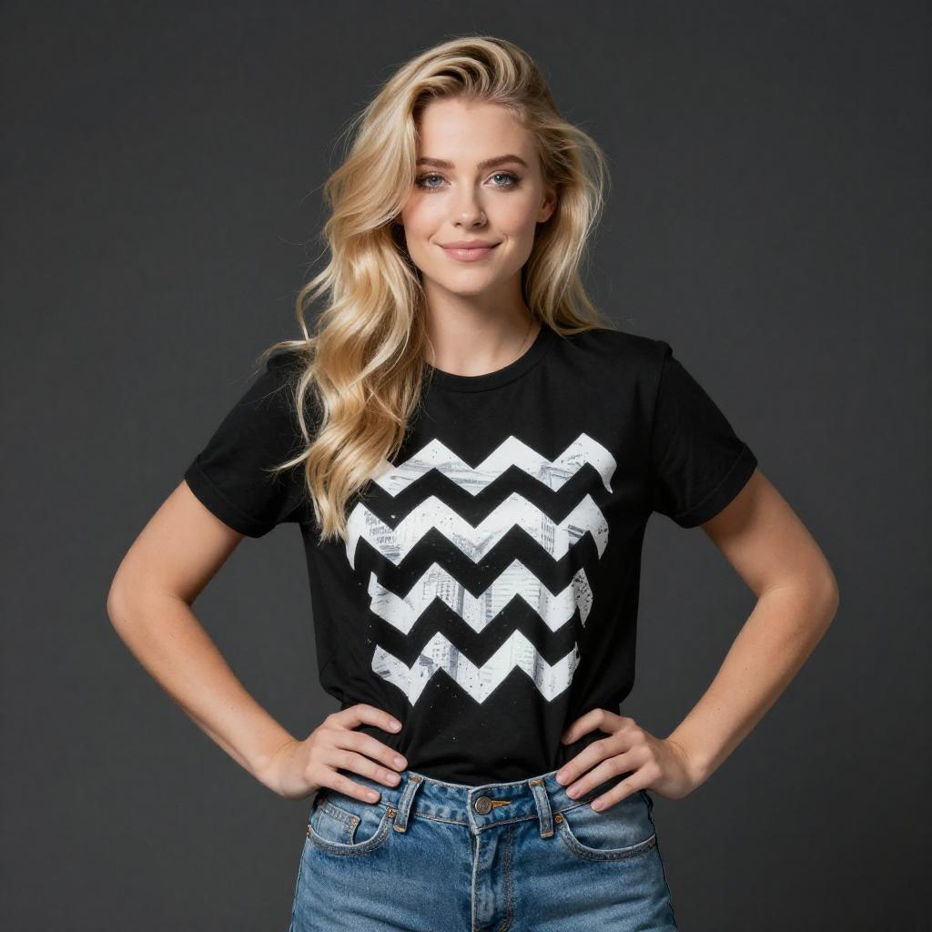 Photograph of a young blonde woman with wavy hair, wearing a black graphic t-shirt with white zigzag patterns and blue jeans. She stands against a dark background with hands on her hips, smiling slightly. The t-shirt features a reflective, urban-themed design.