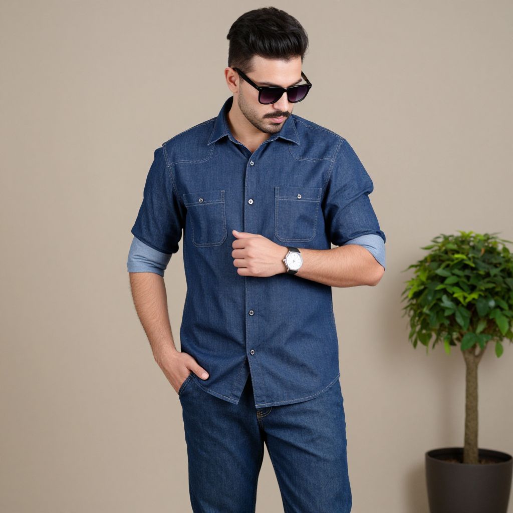 Photograph of a young Caucasian man with short, dark hair and a trimmed beard, wearing dark sunglasses, a denim button-up shirt with rolled sleeves, and matching denim pants. He stands against a plain beige wall, his left hand in his pocket and his right hand adjusting his shirt. A green potted plant is in the background to his right. He wears a white watch on his left wrist. The lighting is even, highlighting the textured fabric of his clothes. The overall style is casual and modern.
