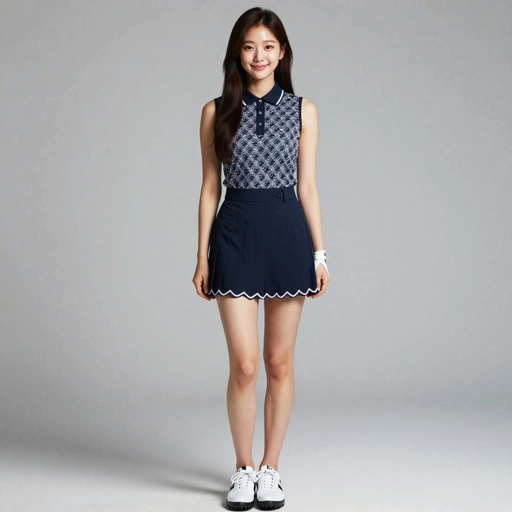 ((best_quality, high_resolution, distimct_image)), ultra_realistic details, sharp focus, detailed skin, full body, (21years old pretty korean girl:1.2), (kpop idol:1.2)(, korean beauty:0.8), (korean mixed), 1girl, shy smile, shoes, Collared sleeveless golf dress with a belted waist and pleated skirt, Patterned golf polo shirt and golf shorts with a scalloped hemline, Printed golf dress with a mandarin collar and flowy silhouette, (indoor studio background)