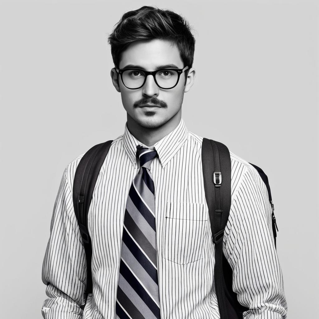 Black and white portrait of a young man wearing rectangular glasses, a striped dress shirt, and a striped tie. He has short, neatly styled hair, a mustache, and a goatee. He is also wearing a backpack with visible straps against a plain light background.