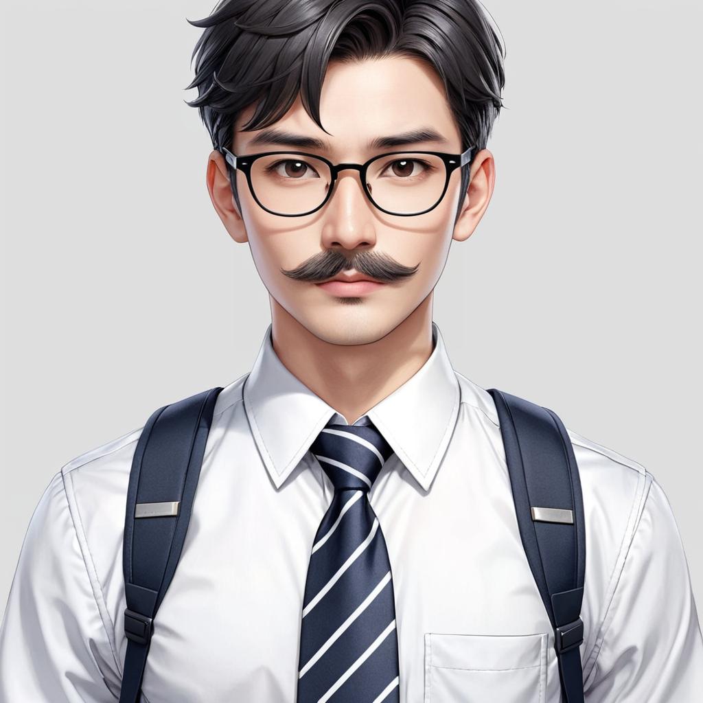 1boy, monochrome, greyscale, necktie, male focus, solo, glasses, shirt, looking at viewer, collared shirt, upper body, breast pocket, simple background, facial hair, closed mouth, striped necktie, pocket, striped clothes, bag, backpack, mustache, cropped torso, school uniform, white background, grey background