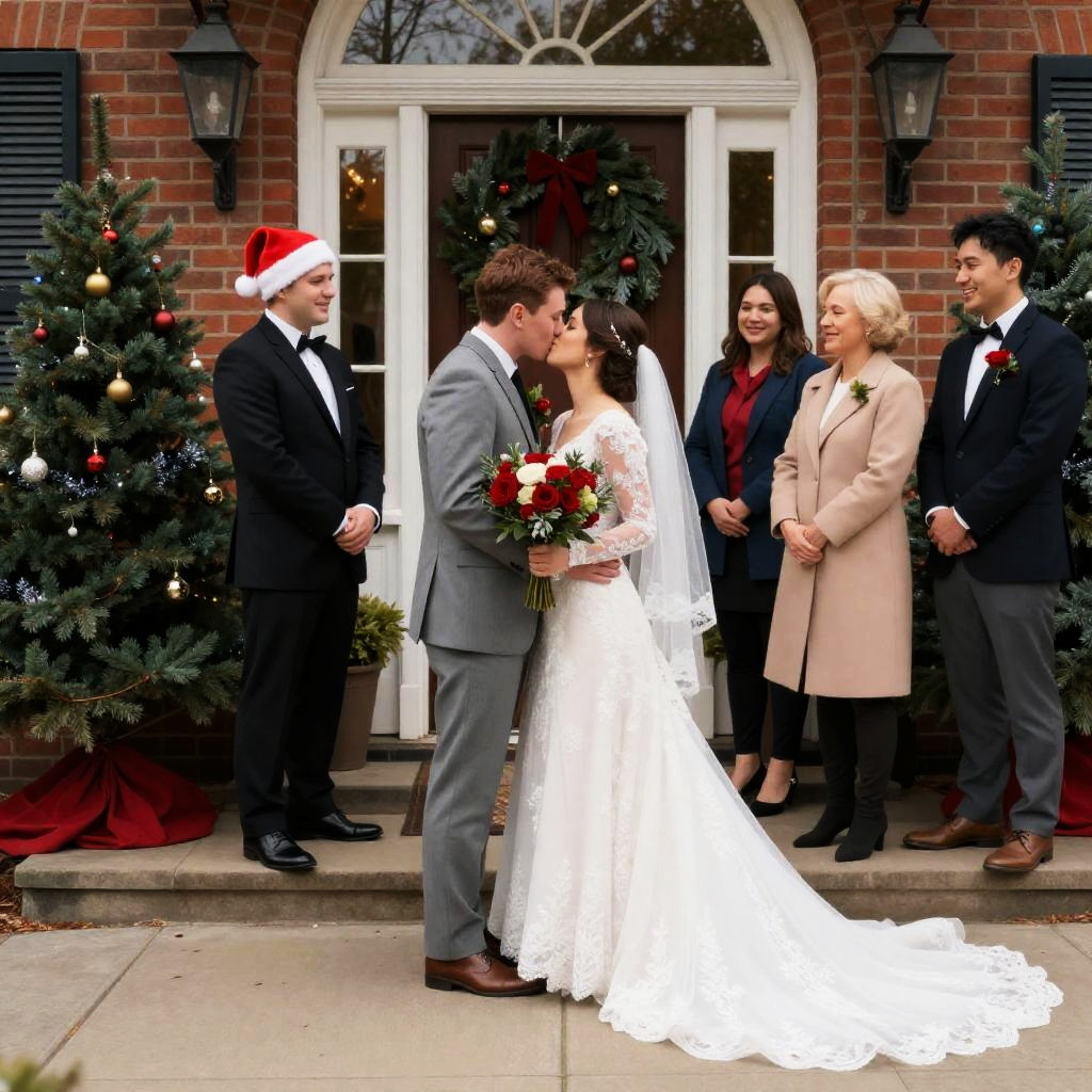 Photograph of a bride and groom dancing closely. The bride, with blonde hair and a white lace dress, wears a long veil. The groom, in a dark suit and white shirt, looks down at her. They are in an indoor setting with string lights and red poinsettias in the background. The bride's arms are around his neck, and his hands rest on her waist.