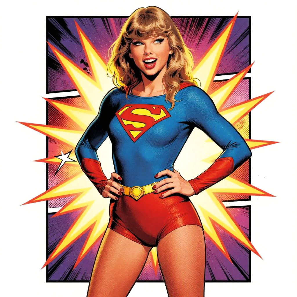 Taylor Swift comic book cover illustration, retro superhero pose, exaggerated expressions, bright neon palette, explosive action lines, detailed costume design, comic panel effects