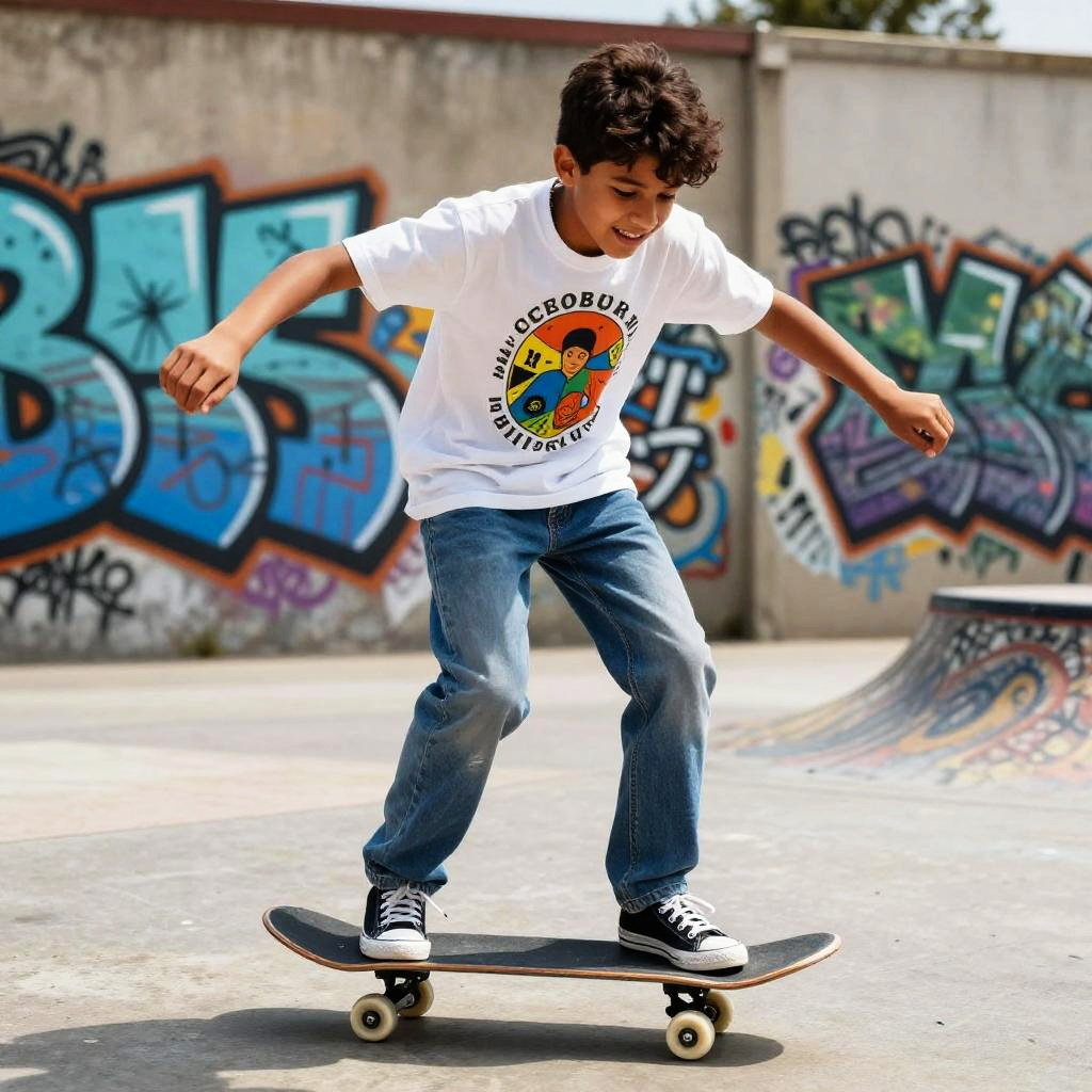 Hispanic teenage boy skateboarding on a sunny day, dynamic action shot, wearing a graphic t-shirt and jeans, urban graffiti walls in the background, expressive face full of joy, natural light, high-detail, modern street culture vibe.