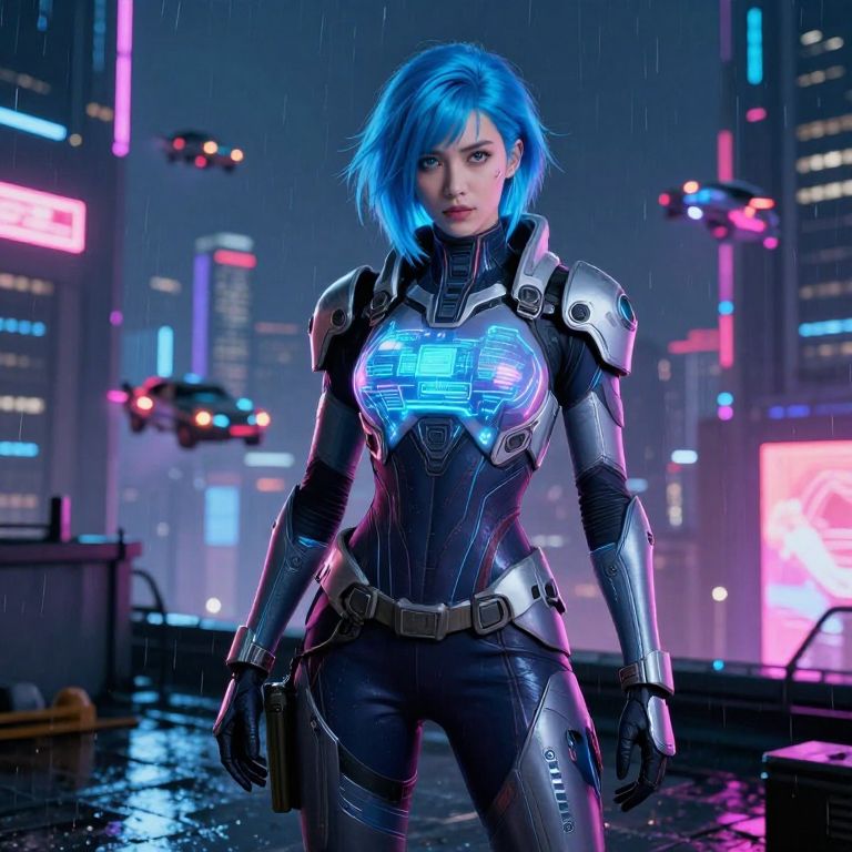 Dalene, a futuristic cyberpunk warrior with neon blue hair, sleek armor with holographic displays, standing on a rain-soaked city rooftop at night, vibrant neon signs and flying cars in the background, dramatic lighting, highly detailed sci-fi concept art