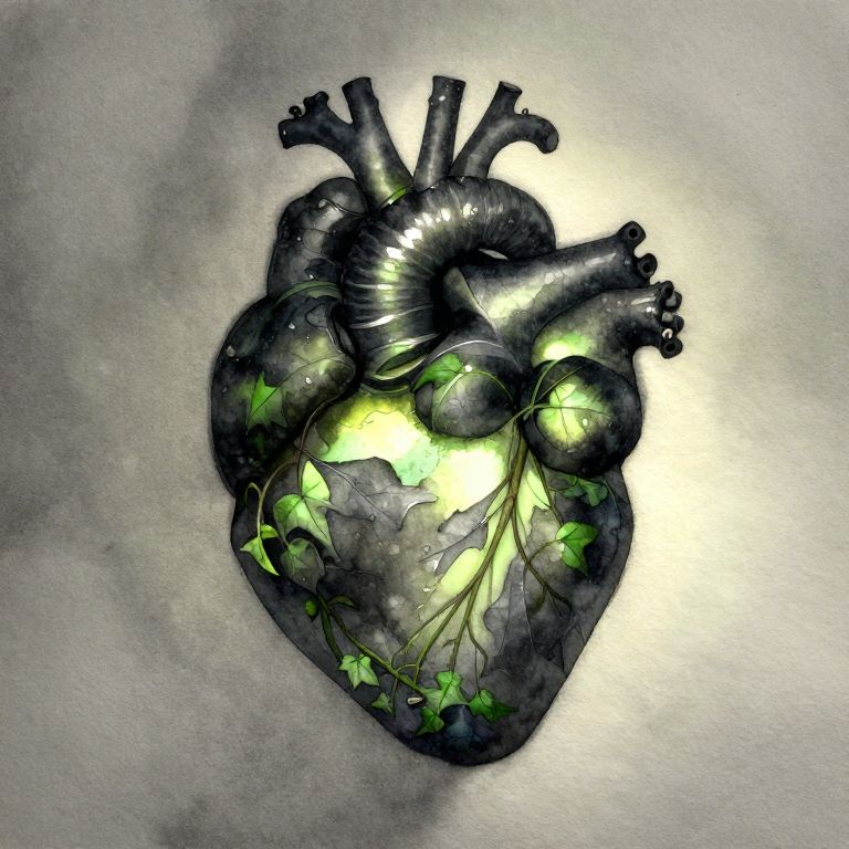 Light And Shadow watercolor sytle anatomical heart in glowing stone covered with ivy black, green, grey,