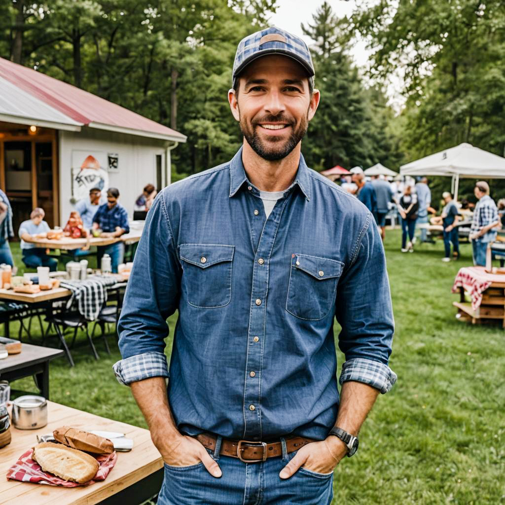 Smiling rugged build man wearing a blue chambray shirt with rolled-up sleeves, a brown belt, blue jeans, and a blue plaid baseball cap standing outdoors at a relaxed BBQ gathering with people and picnic tables in the background.