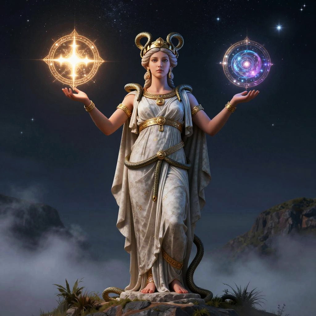 Deusa Hécate standing atop a misty hill under a starry sky, with three glowing orbs representing magic, crossroads, and the underworld, dressed in ancient Greek attire with a crown of serpents, created in a hyper-realistic digital art style