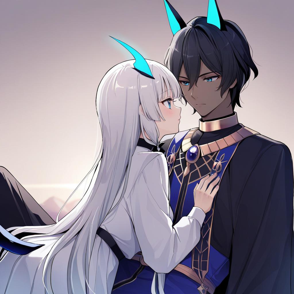 Arjuna alter (fate), fate/grand order, 1boy, dark-skinned male, glowing horns, blue horns, tail, horns, hair between eyes, black eyes, long hair, white hair, black hair, short hair, topless male, jewelry, by artist tsuruse, illustrious