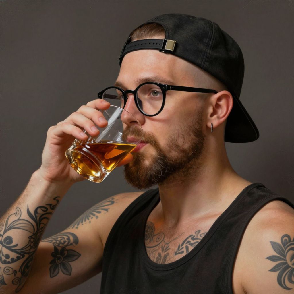 Portrait of a young, bald, bearded, and tattooed man, wearing glasses and a backwards hat, drinking a glass of whiskey, digital painting, highly detailed, hd, 4k, trending on artstation