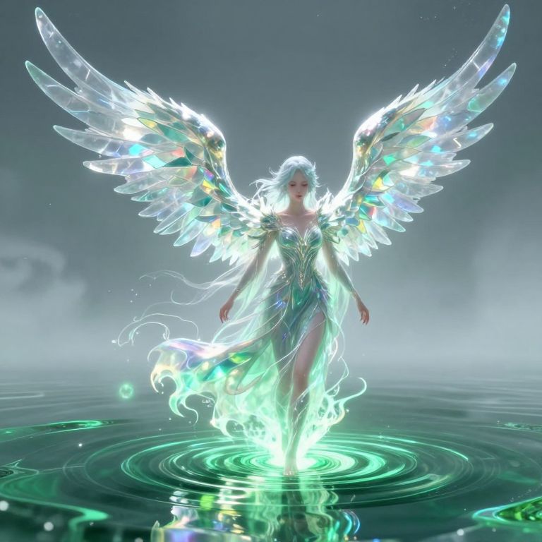 A winged lych in flowing robes that ripple like flames, her wings made of transparent obsidian fragments reflecting rainbow-hued light, She walks across a body of liquid emerald, each step creating ripples that form fleeting visions of unknown worlds, The space around her is misty and timeless, glass wings, liquid reality, transient worlds, Stylized anime-fantasy with luminous reflections and soft ethereal effects, elaborate fine details