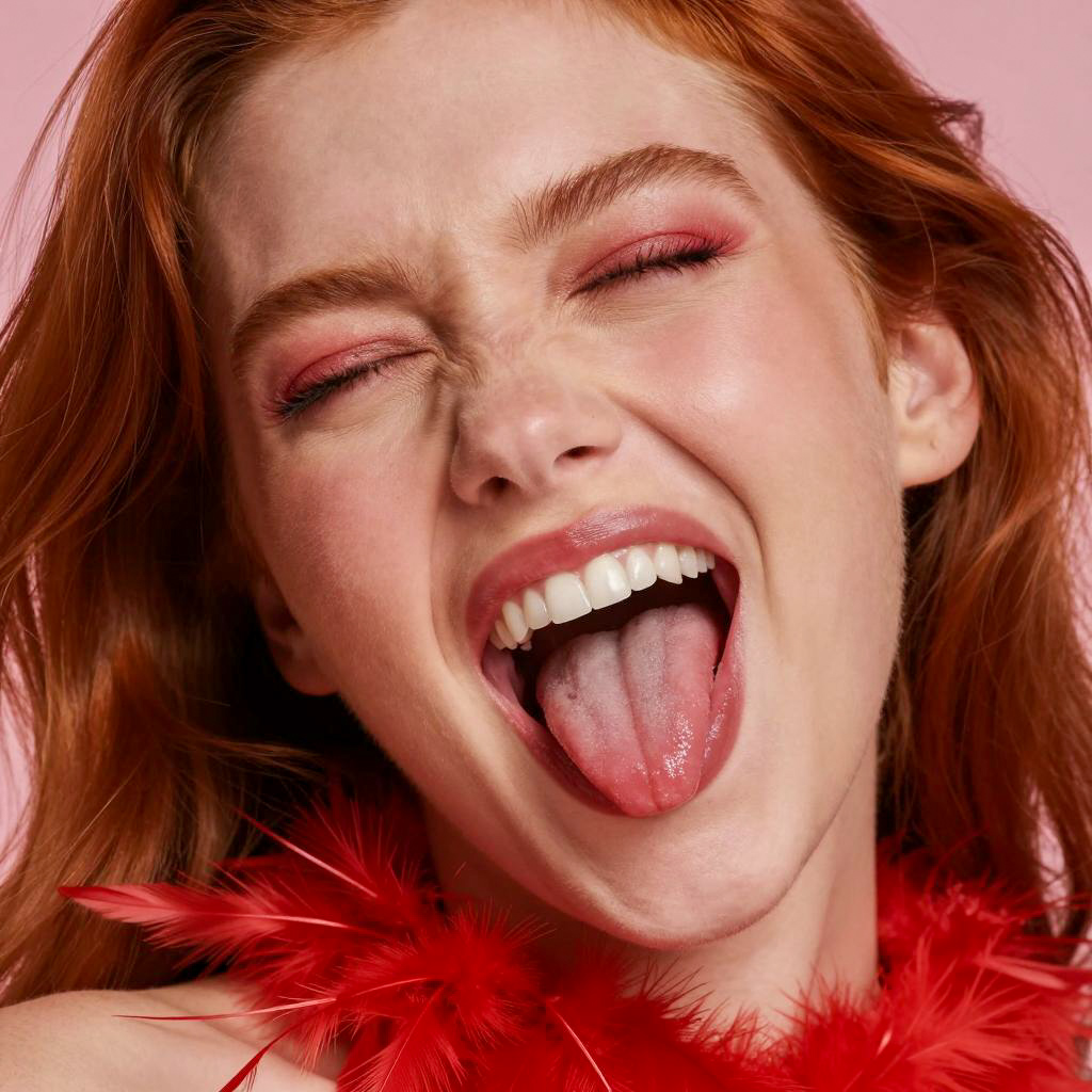Blonde woman with ponytail, wearing white strapless top and pink velvet mini-skirt, large silver earrings, and white sunglasses, holds small white cake in right hand, sticks tongue out while licking left hand, pink background, shadow on left.