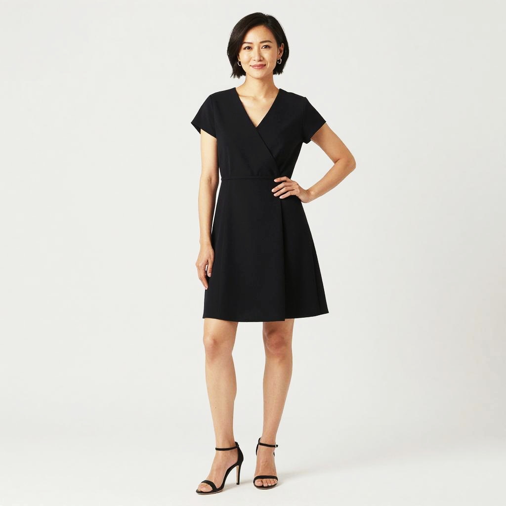 Photograph of an Asian woman with short black hair, standing against a plain white background. She's wearing a black, short-sleeved, V-neck dress that falls just above her knees, cinched at the waist with a slight flare. She has a confident smile and is wearing black strappy high-heeled sandals. Her left hand rests on her hip, and her right arm hangs naturally by her side.