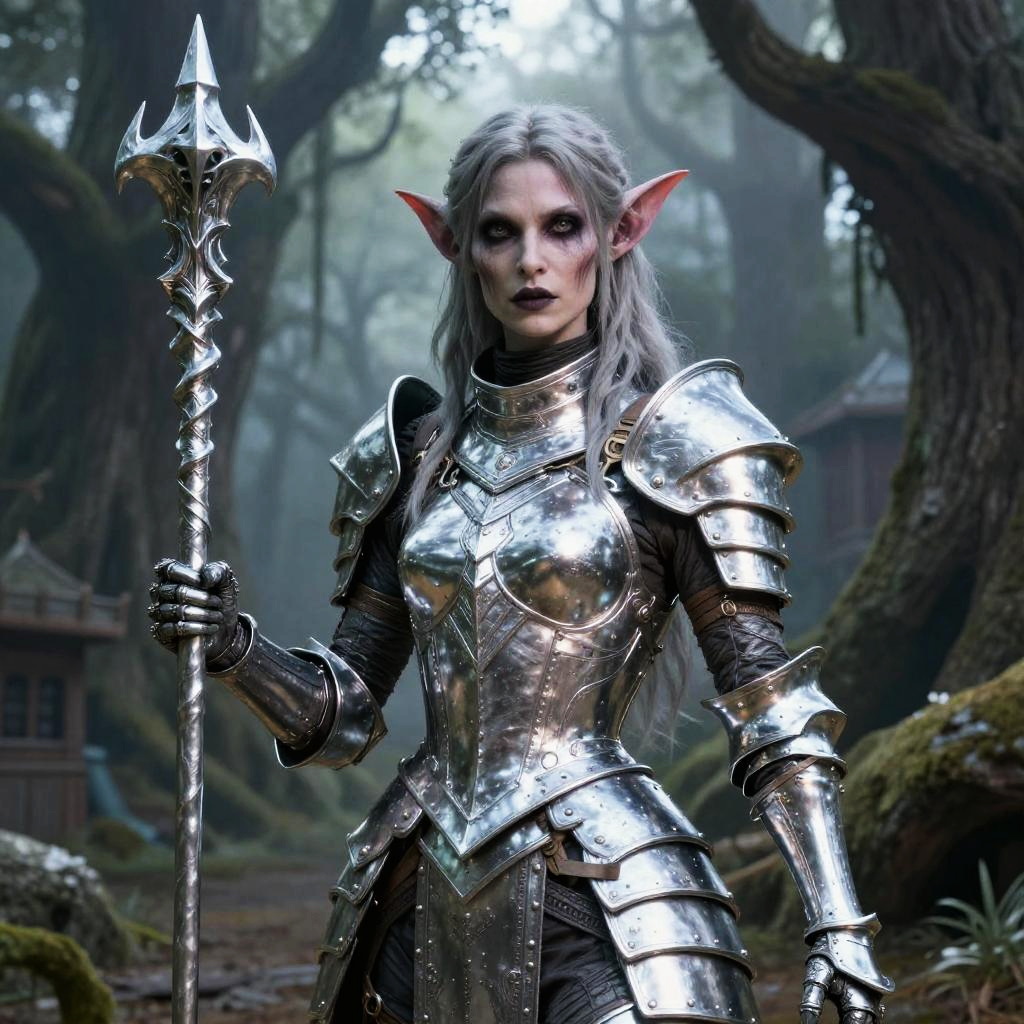 Female draenei paladin in a mystical forest, glowing blue eyes, ornate silver and gold armor with holy emblems, wielding a shining hammer, powerful and serene, high fantasy artwork