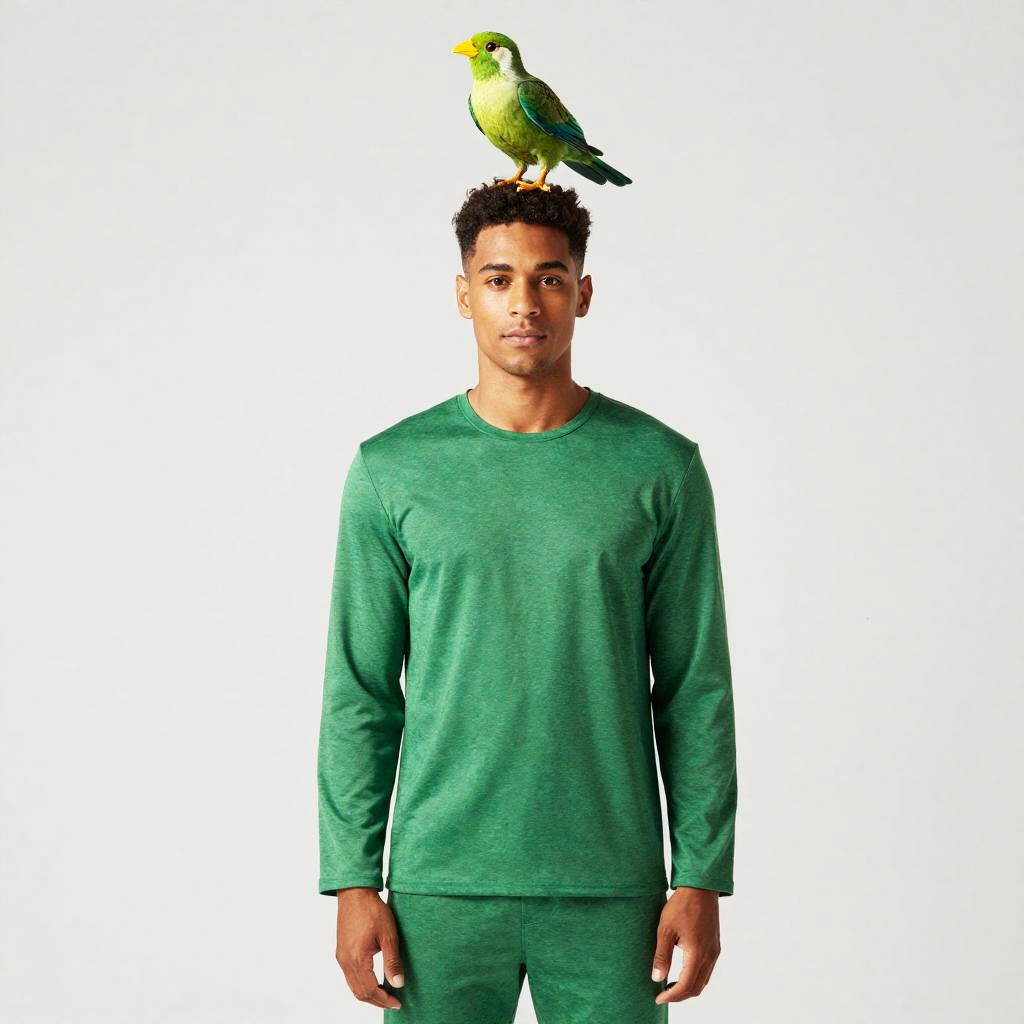 Portrait of a young man wearing a green long-sleeve shirt and matching pants, standing against a plain light background. A small green and yellow bird is perched on his curly hair. The man has a calm expression and the overall composition highlights the matching green tones between the outfit and the bird.