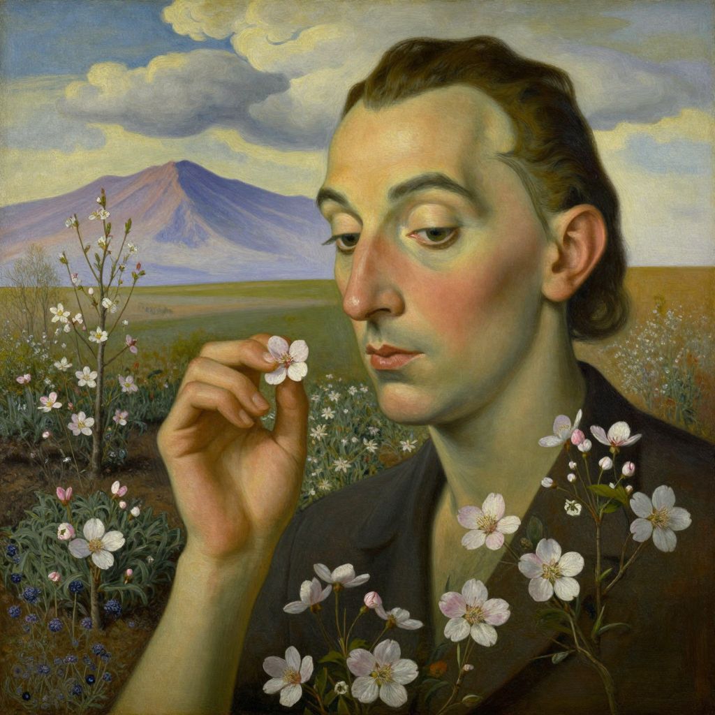 Surrealist painting of a pale-skinned woman with dark hair, gazing at white flowers, mountain and cloudy sky in the background.