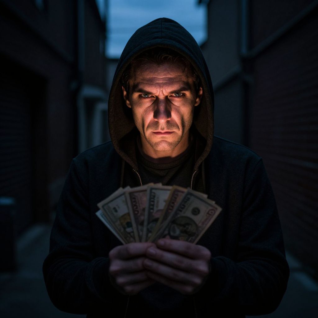 Photograph of a menacing man in a dark hoodie, holding several dollars, illuminated by intense red light, in a dim alley at dusk.