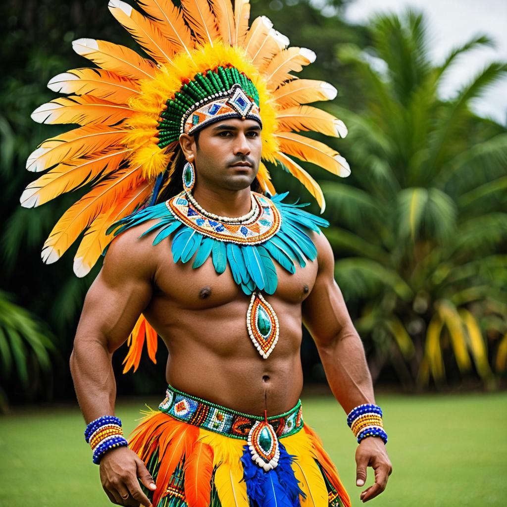 Male samba costume, photorealistic, male dancer, Polynesian style, muscular physique, tan skin, wearing elaborate traditional costume, bright orange and yellow feathers, intricate beaded jewelry, blue and green gemstones, feathered headdress, chest and shoulder adornments, orange feather skirt with blue gems, confident expression, outdoor setting, blurred background with greenery, tropical atmosphere, vibrant colors, cultural attire, detailed ures on feathers and beads, traditional dance costume, festival or ceremonial setting