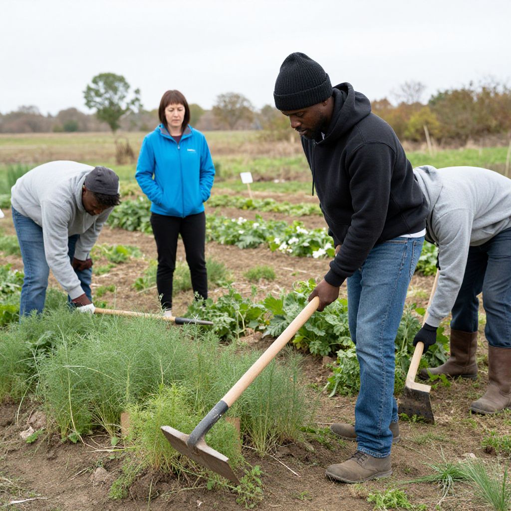 Photograph of four Black men working in a lush vegetable garden. Three men in the foreground, wearing white and black hoodies, black beanie, and black pants, use wooden-handled hoes to tend to green plants. The man in the background wears a blue jacket and white cap, observing. The garden features various leafy greens, with a small grey shed and trees in the blurred background. Overcast sky and earthy tones dominate the scene. The men are focused on their tasks, highlighting a community gardening effort.