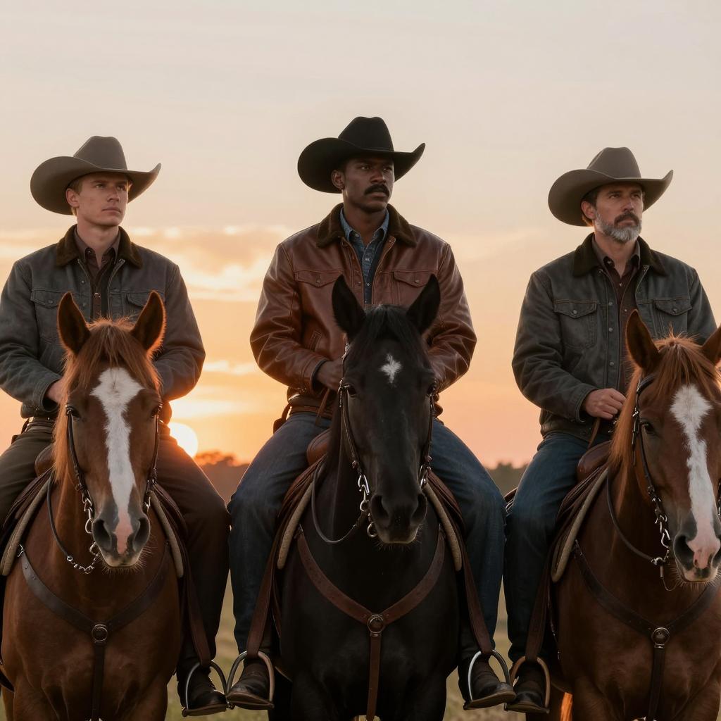 Photograph of seven men in rugged Western clothing, standing and kneeling in a desert landscape with mountains in the background. They wear hats, vests, and boots, holding guns and a holstered pistol. Facial expressions are serious and determined. Six men stand, one kneels in front. Sunlight casts shadows.