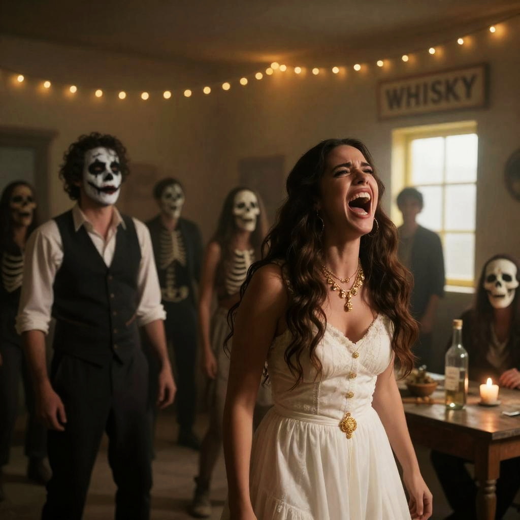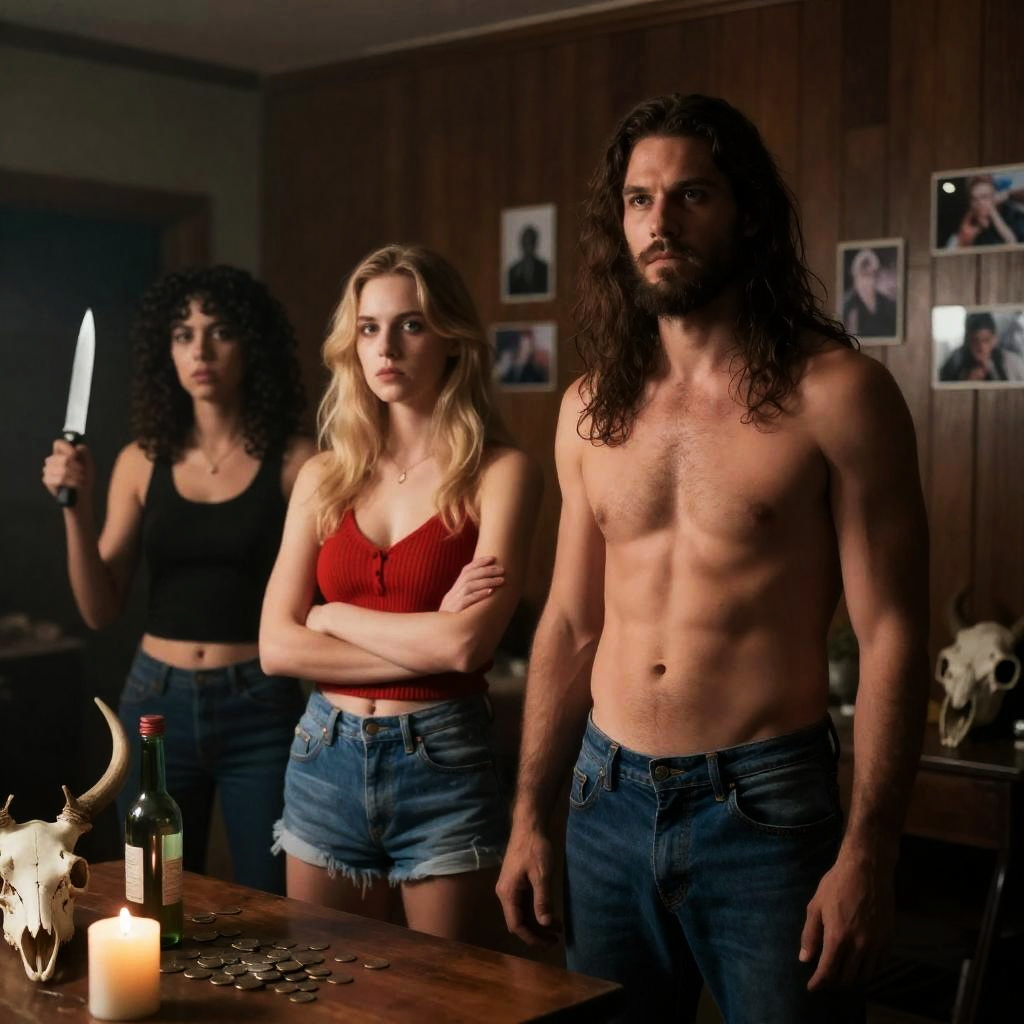 Photograph of three people in a cluttered room. Blonde woman in red shirt and denim shorts stands left, cheering. Shirtless man with beard holds up brown-haired woman with dark makeup, mid-air, right. Table with candles, bottles, pizza, and skull decoration. Background has patterned wall and posters. Intense expressions. Three people. Dim lighting.