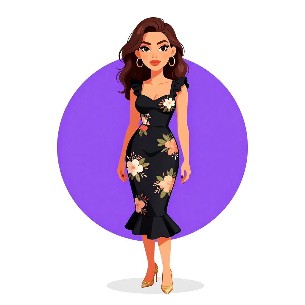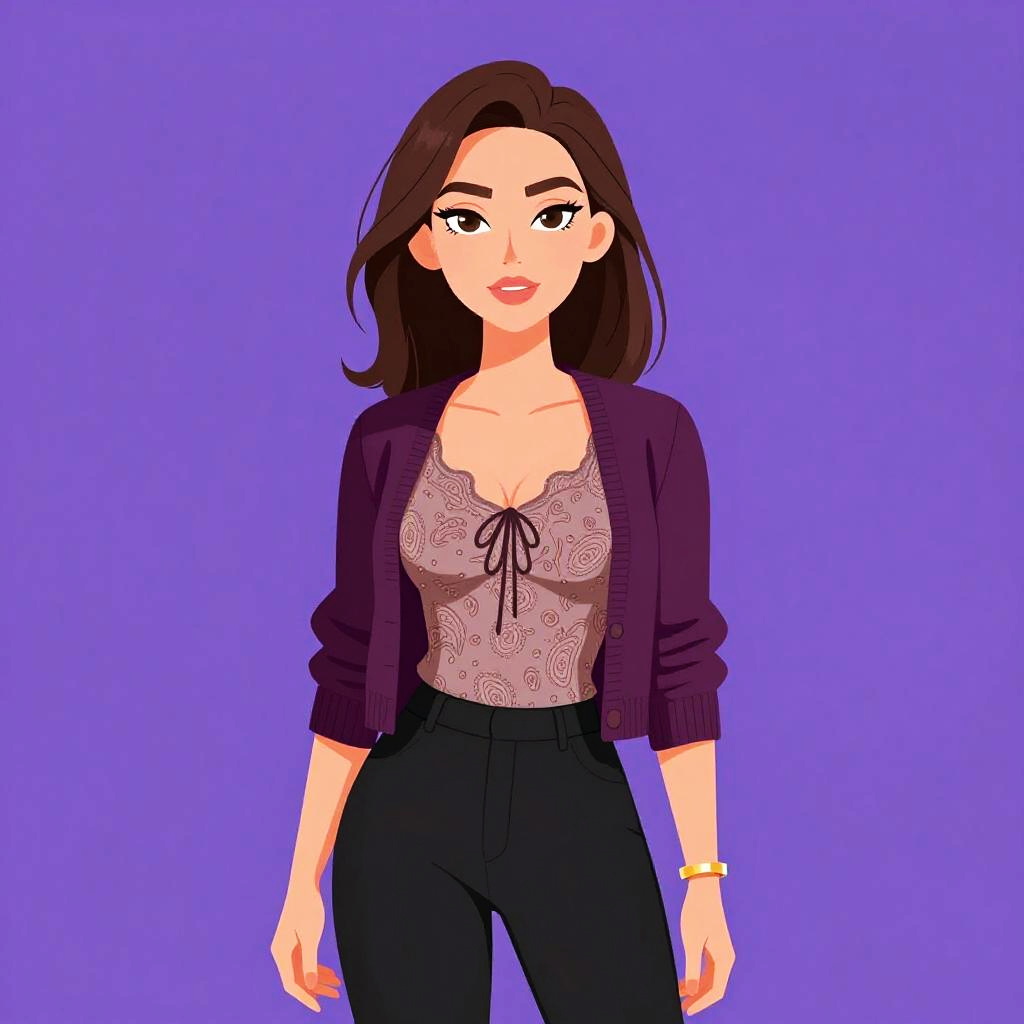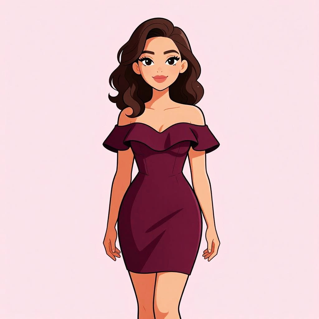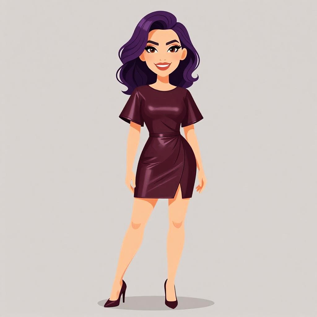Woman with pretty face and pretty hair. smiling Woman, contemporary chic, burgundy leather mini dress, short dolman sleeves, round neckline, wrap-style skirt with a notched hem, bare legs, matching pointed-toe pumps, neutral backdrop --sref 1461