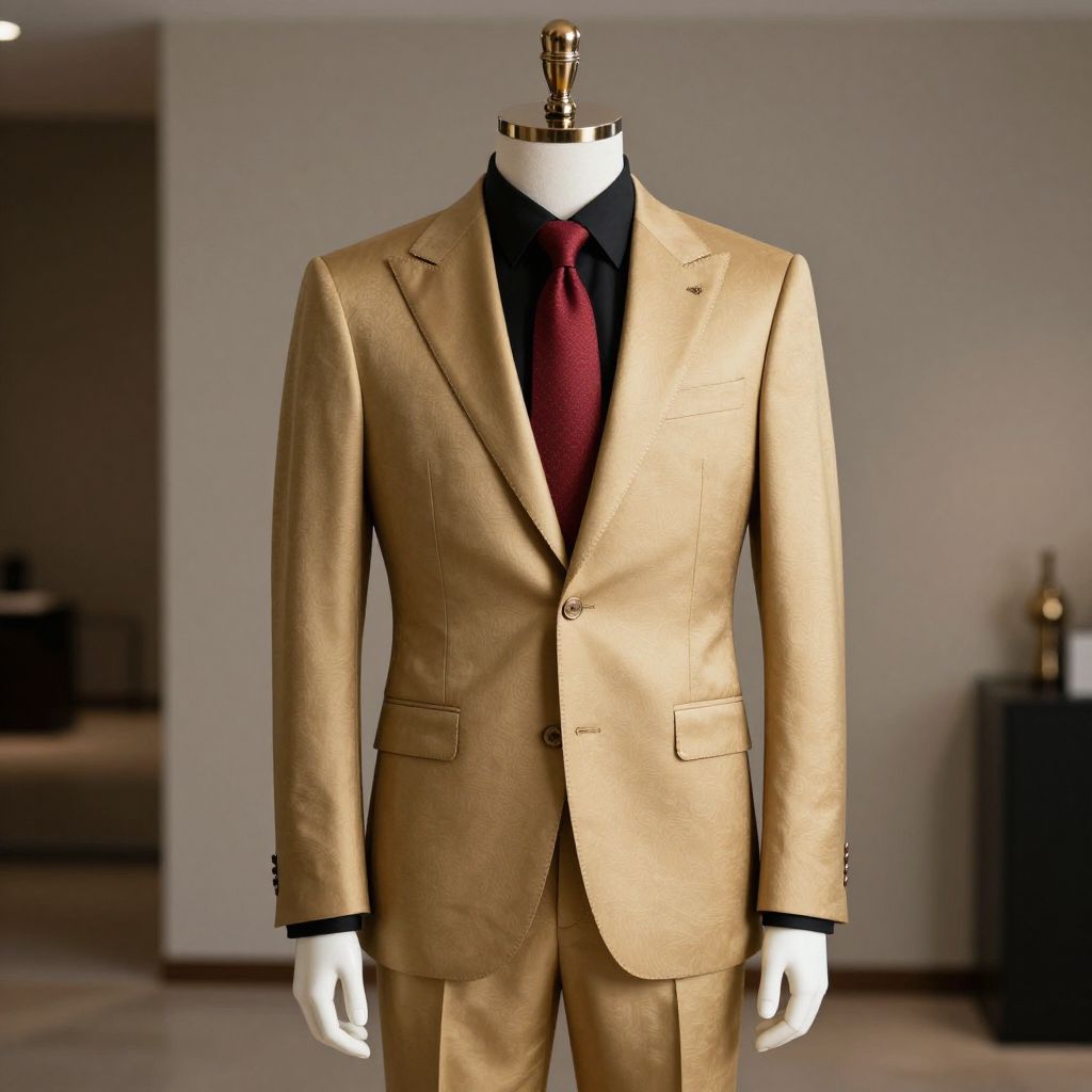 A mannequin wearing a gold suit with a black shirt and a red tie, standing in a stylish, minimalist interior space with soft lighting, emphasizing the elegance and sophistication of the outfit. The mannequin's pose is poised and confident, reflecting the formal and refined nature of the attire. The background is subtly designed to highlight the mannequin without overpowering the details of the clothing.