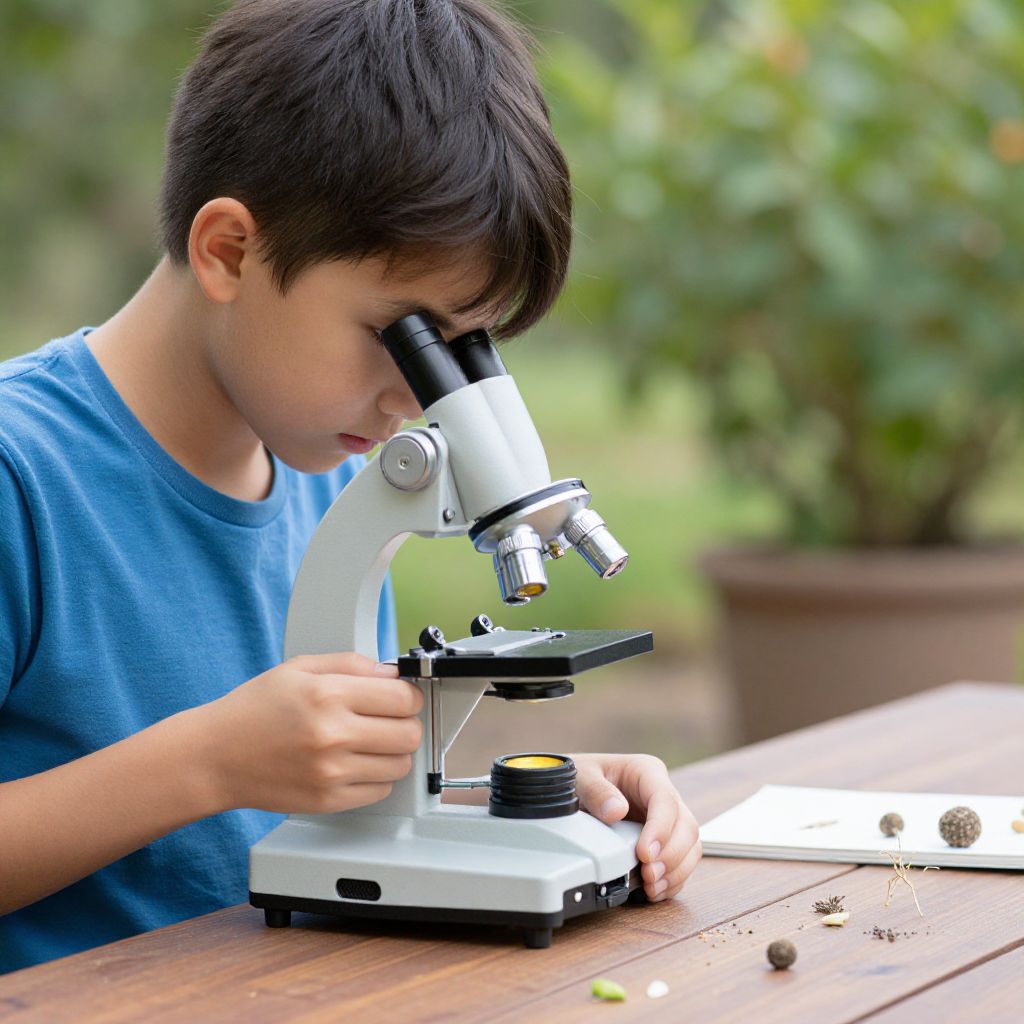 Nature a child using their microscope to explore their own backyard, looking for interesting specimens to study.,