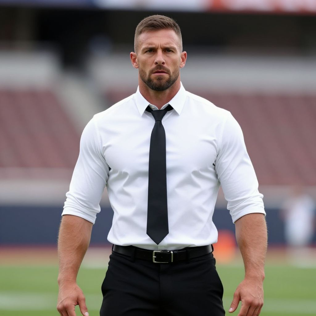 A realistic portrait of a tall man in a luxurious, high-end fancy baseball costume—dark blue suit base with red baseball-style lapels, a white vest with visible stitching, and a custom red baseball cap. He has a strong facial structure, piercing blue eyes, and a calm, authoritative look, sitting on a wooden bench in a modern sports museum with a large baseball display and illuminated retro banners.