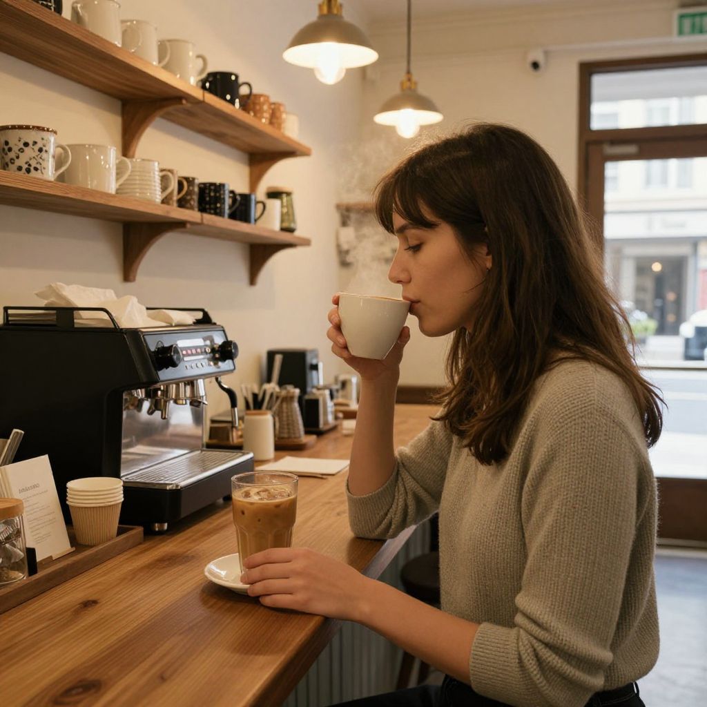 Woman sipping steaming coffee in a cozy café, surrounded by warm lighting, shelves of ceramic mugs, and a view of the street outside, as she rests her hand on a wooden counter beside a glass of iced beverage and a coffee machine.