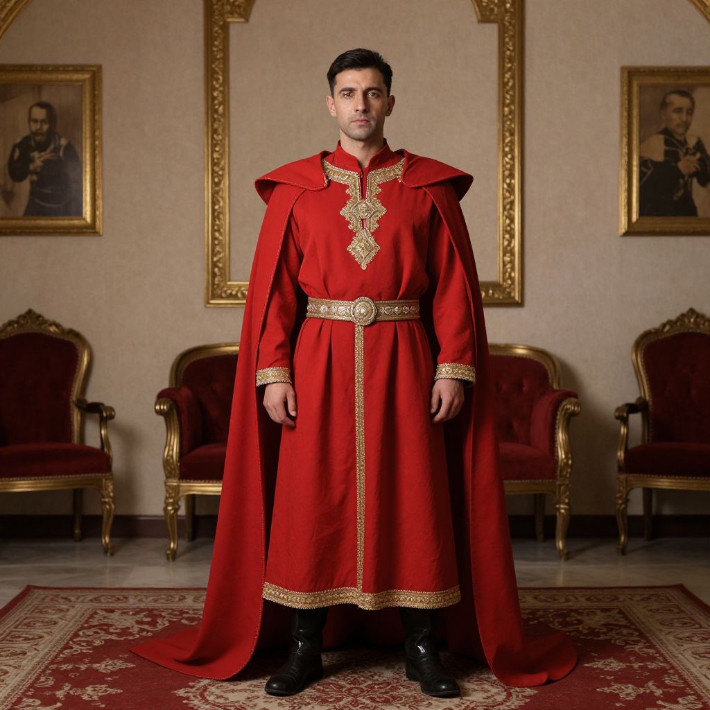 Photograph of a young man with short black hair, standing in an opulent room. He wears a long, red, ornately embroidered medieval-style tunic with gold trim and a matching red cape. His black boots are polished. The background features a beige wall with two gold-framed portraits on either side, and two red velvet armchairs with gold trim flanking him. The floor is covered with an intricate red and gold patterned rug. The lighting is warm, highlighting the richness of the red and gold colors.