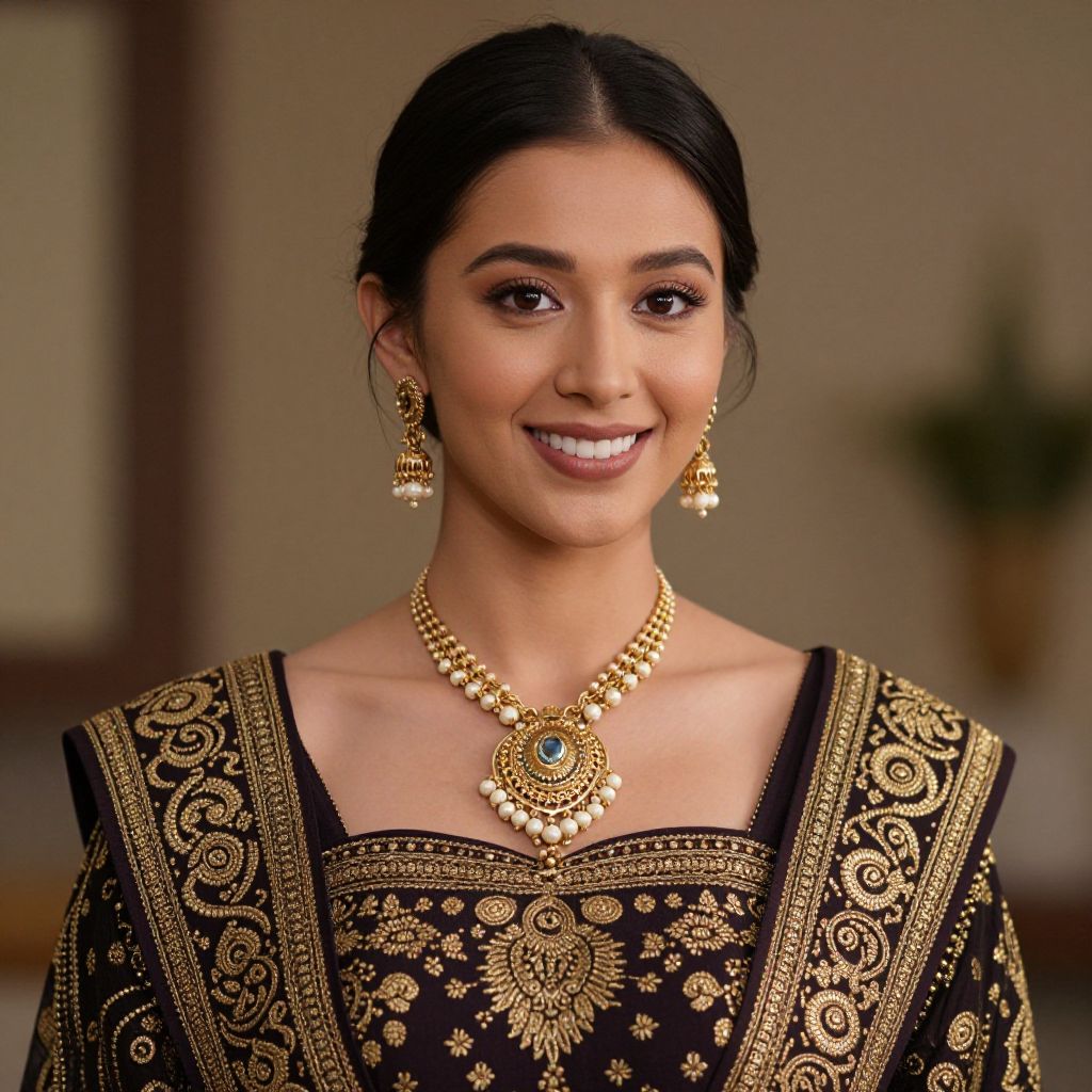 Photograph of a smiling South Asian woman with medium brown skin and dark hair tied back. She wears a black traditional outfit with gold floral embroidery, accompanied by ornate gold jewelry including a large, intricate necklace, matching earrings, and a nose ring. Her makeup is subtle with dark eyeliner and nude lipstick. The blurred background features soft brown and beige tones, with a potted plant slightly visible to the right. The image has a warm, soft-focus effect highlighting her elegant attire and jewelry.