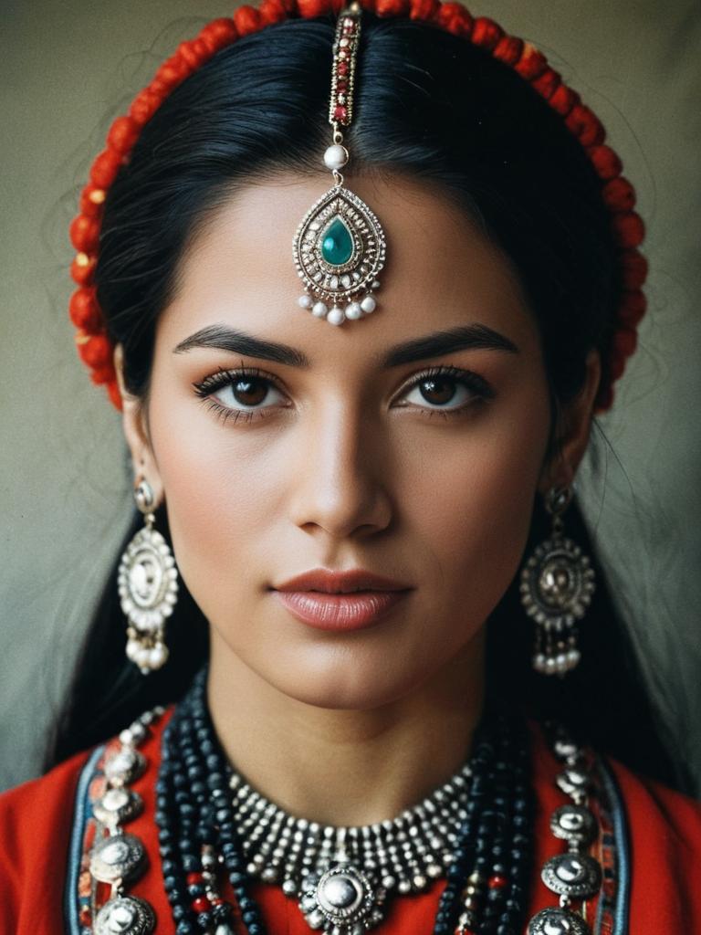 Woman in Traditional Dress, close-up detailed headshot with jewelry