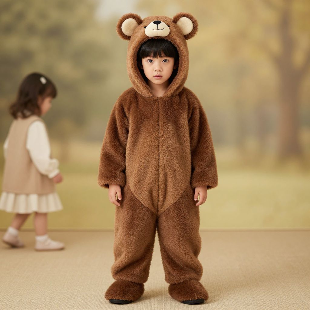 Photograph of an Asian toddler in a brown bear costume with bear ears and face, standing in front of a blurred forest background, with another child in