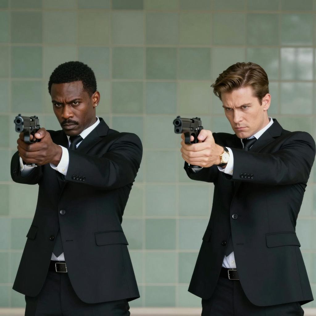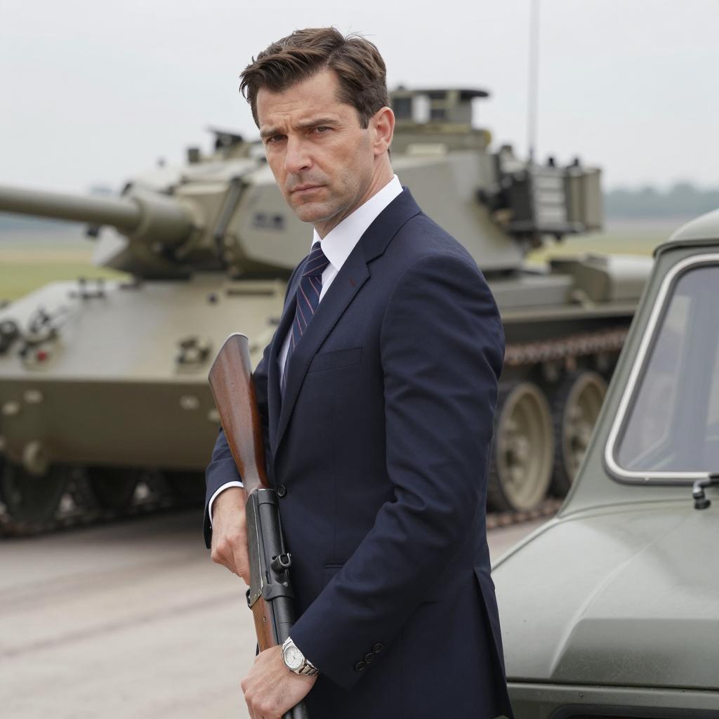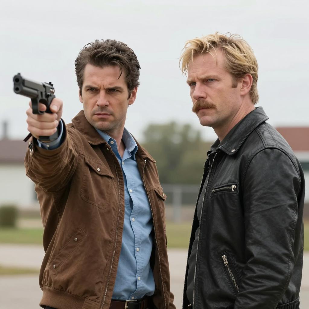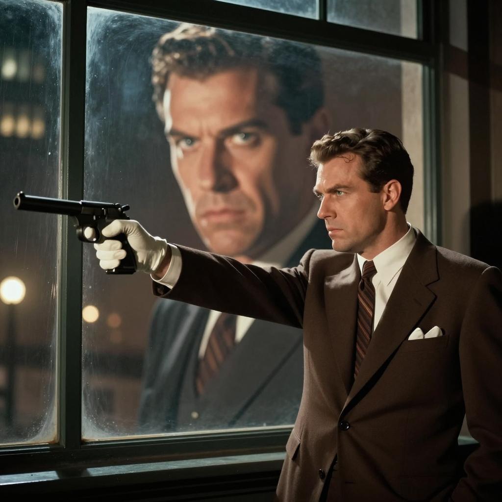 A man in a brown suit, leaning against a car, points a gun forward. Background: foggy street with classic cars, people, and a building. He has short brown hair, intense expression. Car on the left, another on the right.