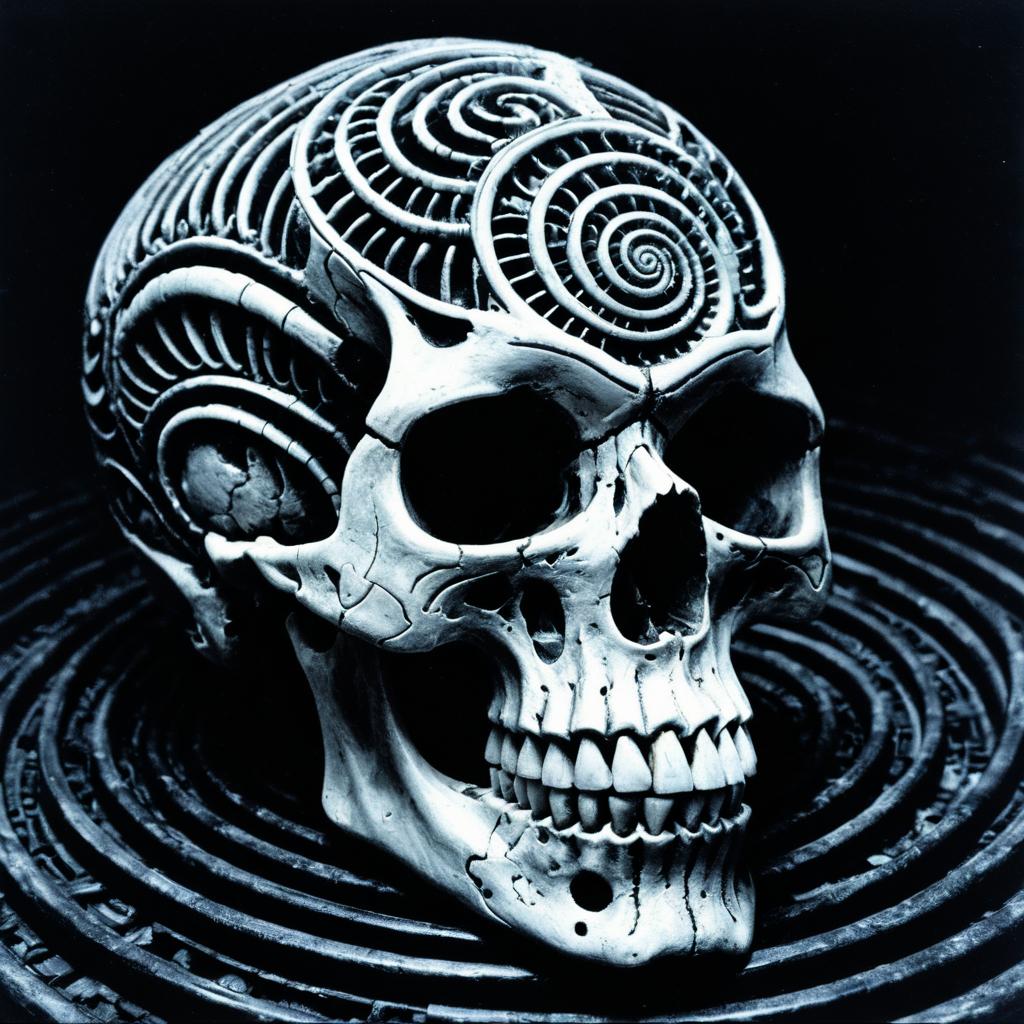 Enigmatic skull with spiraling patterns, emotional, conceptual design, by H.R. Giger, Clive Barker, medium wide shot