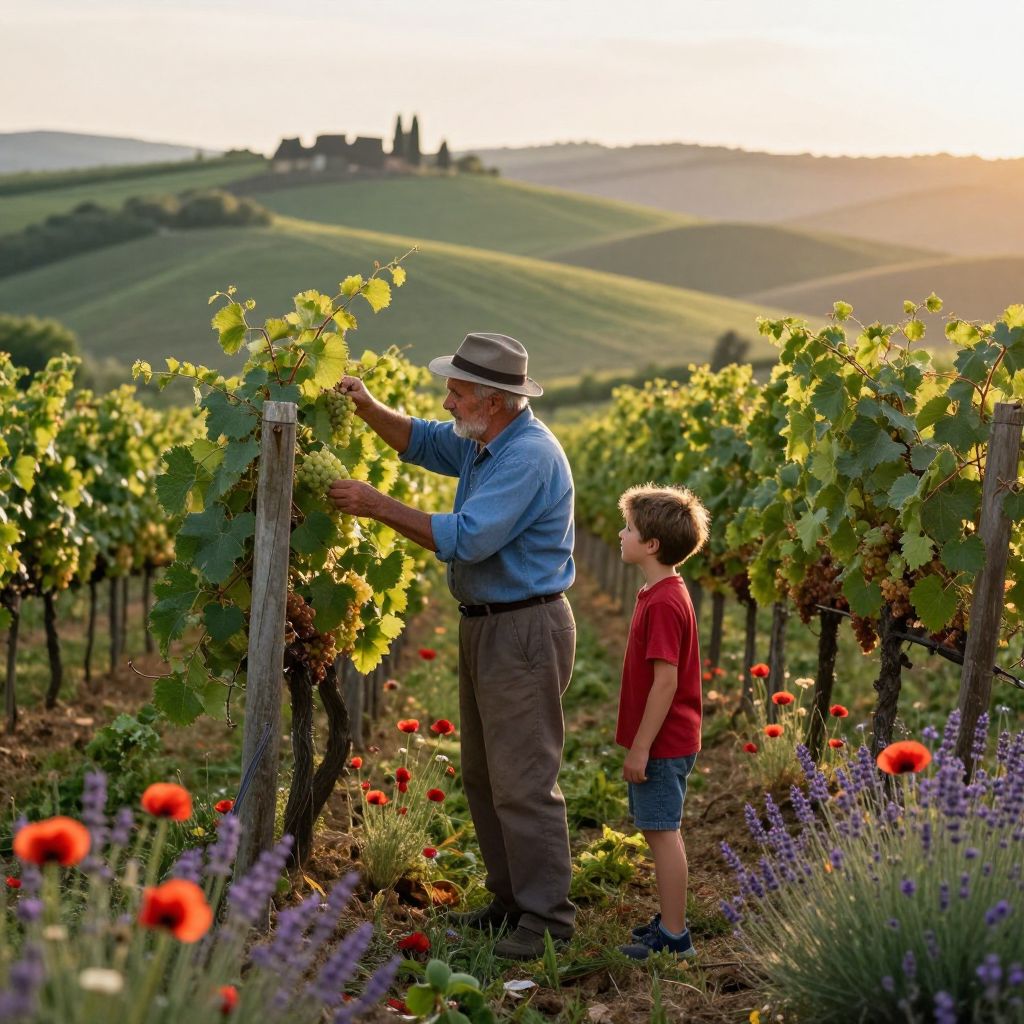 In this enchanting Tuscan vineyard, an old man and a young boy are immersed in the tranquil act of picking grapes, their figures bathed in the soft, morning light that filters through the rolling hills. The vineyard, a lush expanse of greenery, is dotted with vibrant poppies and lavender, their colors vivid against the verdant backdrop. The old man, clad in a weathered blue shirt and a hat, holds a cane, his presence a testament to the passage of time. Beside him, the young boy, dressed in a red shirt and shorts, follows closely, his youthful energy contrasting with the man's serene demeanor. The scene is a harmonious blend of natural beauty and human connection, framed by the warm hues of the sunrise and the gentle slopes of the hills, evoking the timeless charm of the Italian countryside.