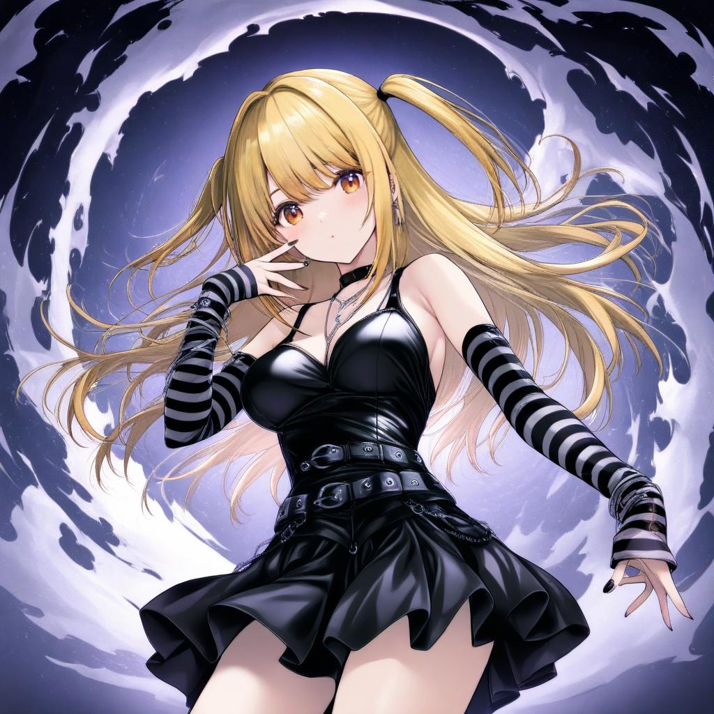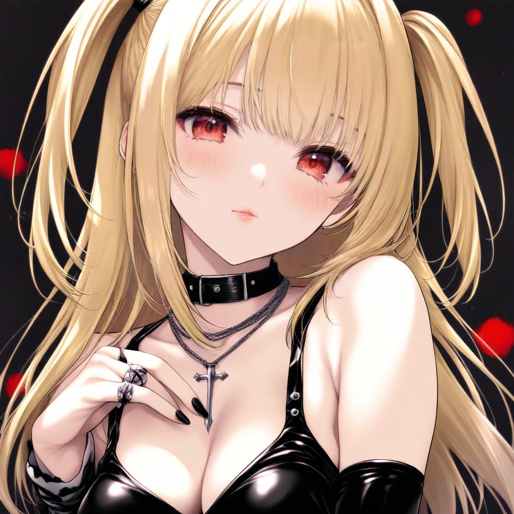 Amane misa, death note, 1girl, red eyes, blonde hair, long hair, two side up, medium breasts, black dress, bare shoulders, detached sleeves, nail polish, goth fashion, goth fashion, by artist uni8, animagine