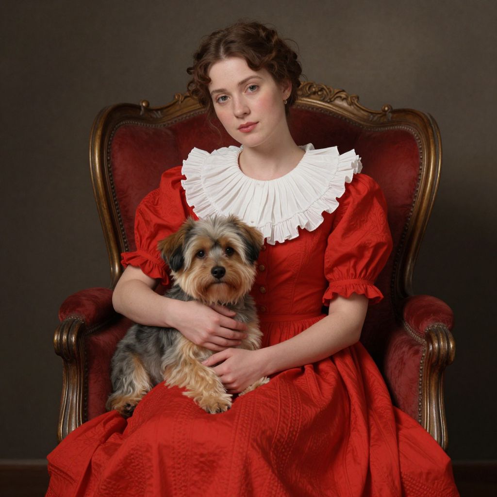 A digital artwork featuring a woman in a vintage-inspired red dress with a white ruffled collar, seated on an ornate red armchair, cradling a small, fluffy dog, rendered with realistic textures and soft lighting reminiscent of classical portraiture.
