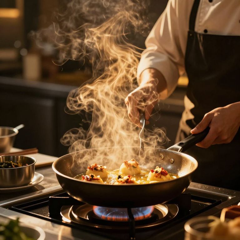Photograph of a chef's hands stirring a sizzling skillet with fiery flames, surrounded by kitchen utensils and dimly lit background.